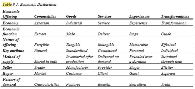 And I’m still waiting for mainstream economists to catch up to the Experience Economy much less transformations. (It just needs one person to champion it in the Bureau of Labor Statistics or its equivalent in other countries. Anyone know anyone???) But the distinctions are clear! Since the new book doesn’t list them in full, let me show here the table of economic distinctions from The Experience Economy (p. 224):